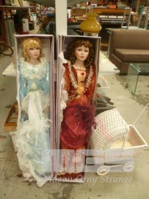 2 x COLLECTORS CHOICE CLASSICAL DOLLS, 105cm (H) & DOLLS PRAM