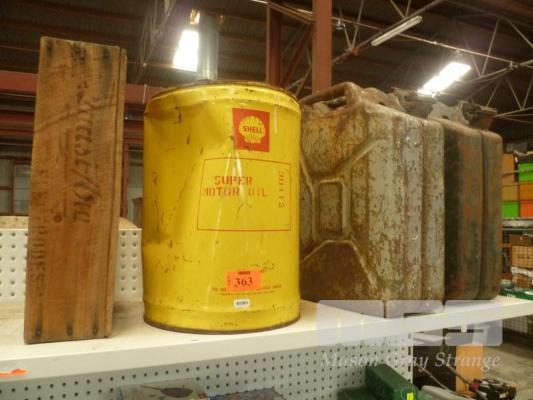 SHELL 5 GALLON IMPERIAL DRUM, 2 x MILITARY JERRY CANS, MARKED 1953 & 1958 & WOODEN BOX