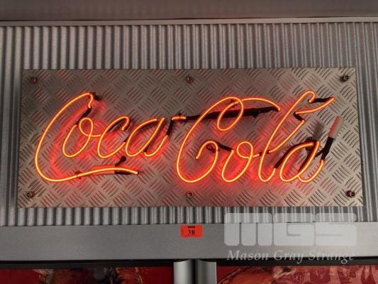NEON COCA-COLA WALL MOUNT SIGN, CHECKER PLATE BASE, 850 x 350mm