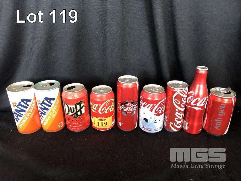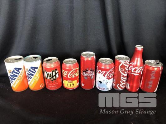 9 x COLLECTABLE COCA-COLA, DUFF BEER, FANTA CANS