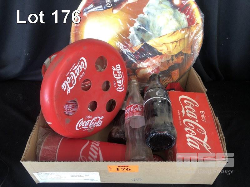 BOX OF VARIOUS COCA-COLA COLLECTABLES, FRISBEE, CHRISTMAS ORNAMENT, 1988 COCA-COLA GLASSES, VINTAGE GLASS BOTTLE COKES, CUPS, YO-YO, TIN BUCKET