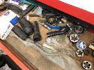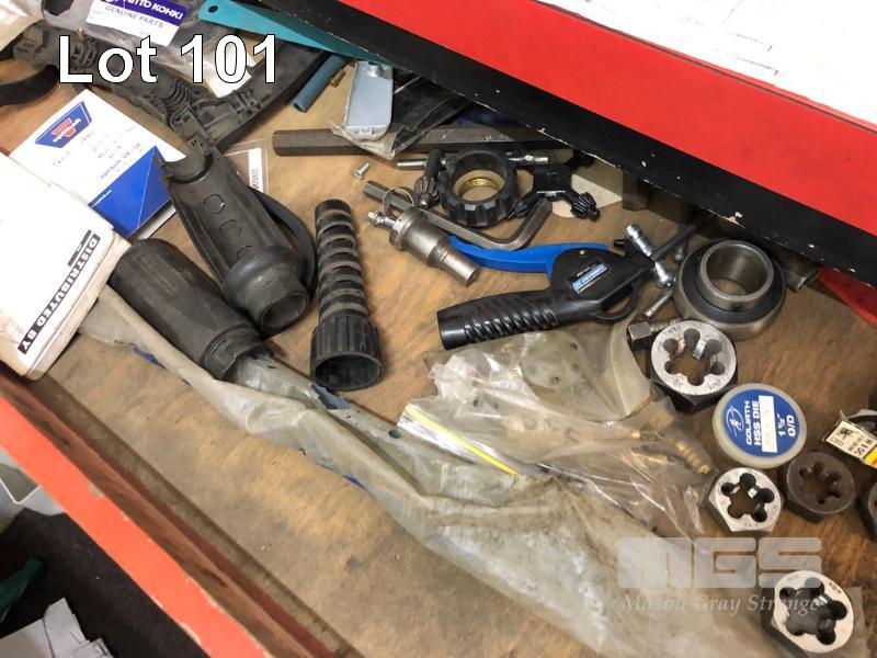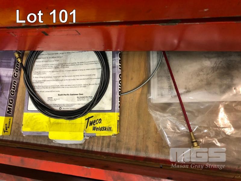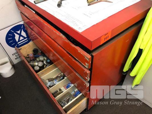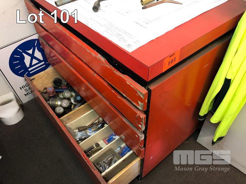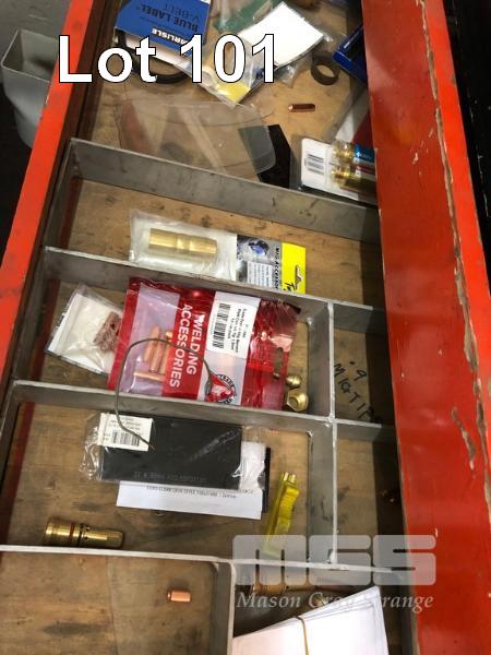 RED, 5 DRAWER STORAGE UNIT & CONTENTS, MIG & OXY ACC SPARES, GAUGES, MIG FEED INNERS, TIPS, FITTINGS, HAND PIECES & MORE