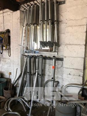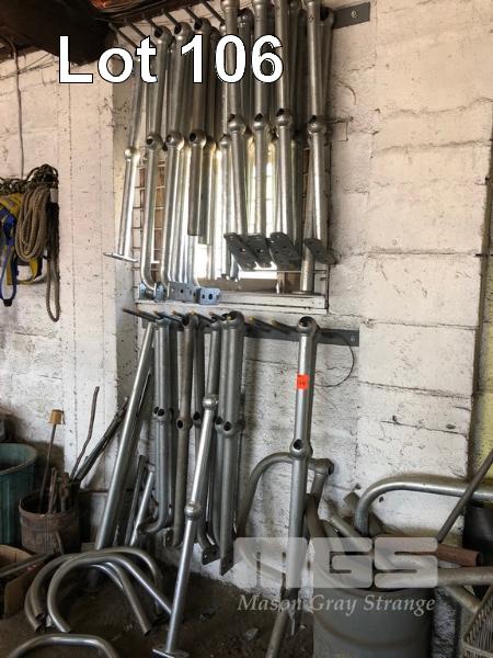QUANTITY GALV RAIL POSTS, BENDS & HARDWARE WITH 2 x WALL RACKS