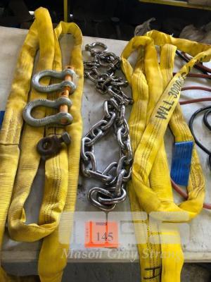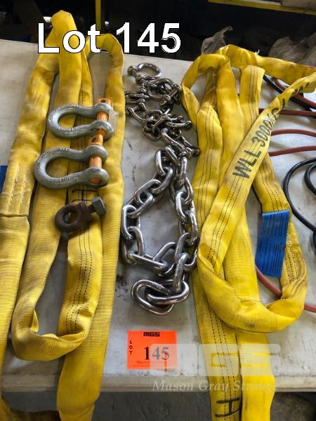 2 x 3 TONNE YELLOW SOFT SLINGS, 2 x 4.7 TONNE SHACKLES & ASSORTED STAINLESS STEEL CHAIN & SHACKLES