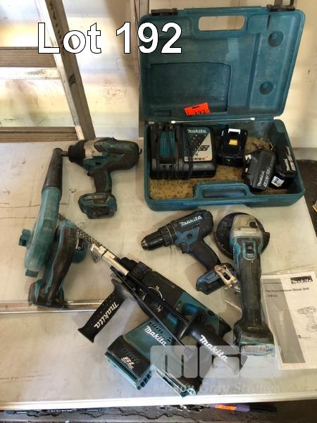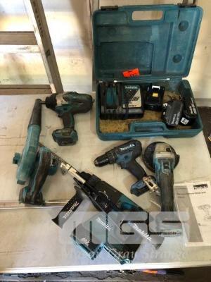 MAKITA CORDLESS TOOL SET INC 1/2 IMPACT GUN, DTW1002, HAMMER DRILL, DHR242, DRILL DHP482, ANGEL GRINDER, 125mm, DGA504, BLOWER, DUB182, CHARGER & 3 x BATTERIES