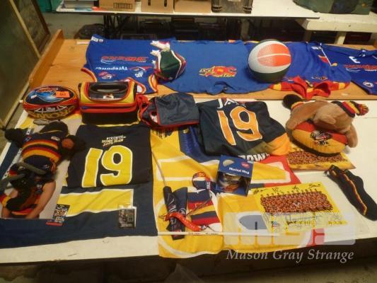 ADELAIDE CROWS MEMORABILIA INC FLAGS, TOPS, SIGNED PHOTOGRAPH, ETC, 1 x TABLE