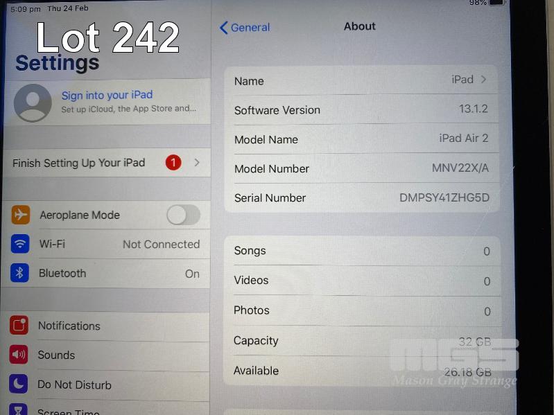 APPLE iPAD AIR 2, 32GB, Wi-Fi, SPACE GREY, MODEL A1566 (NO CABLE, NO CHARGER) (NOTE: DAMAGED SCREEN) S/N:DMPSYGYSHG5D