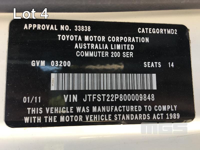 2010 TOYOTA HIACE COMMUTER 200 SER. MINI BUS 2x4 REG: S243 BXI (SA) VIN: JTFST22P800009848 ODO: 315,937kms SHOWING 4 CYLINDER, AUTOMATIC TRANSMISSION, DIESEL, WHITE DUCO, 3 DOORS, 11 SEAT, 2x4 AIR BAG, AIR CON, BLUETOOTH, CD PLAYER, CENTRAL LOCKING, POWER STEERING, POWER WINDOWS, SPARE WHEEL, KEY #6 (WITH PAPERS, WITH 2 KEY/S) CONDITION: BODY - MINOR PAINT SCRATCHES