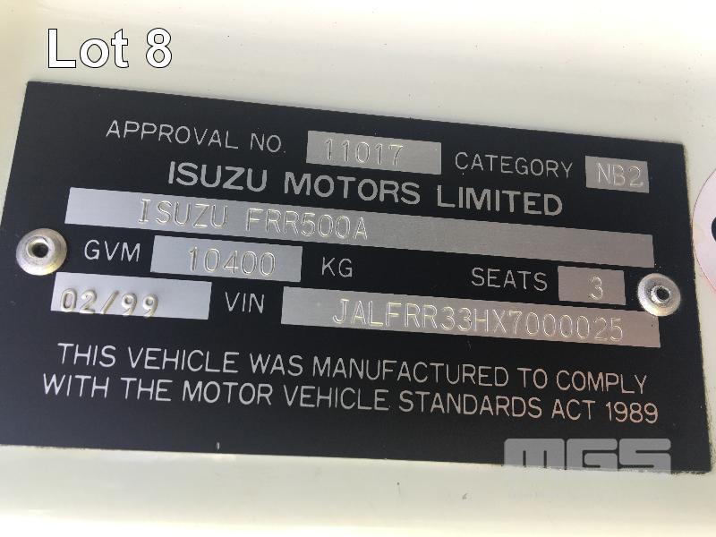 1999 ISUZU FRR500A MEDIUM 4x2 TAUTLINER REG: XOS 857 VIN: JALFRR33HX7000025 ENG: 6HHI-283025 ODO: 823,440kms GVM: 10,400kg GCM: 14,890kg TARE: 4,620kg ISUZU-6HH1-N, 6 CYLINDER, 5 SPEED MANUAL TRANSMISSION, DIESEL, SPRING SUSPENSION, WHITE DUCO, 9.5 R17.5 2 DOORS, 3 SEAT, AIR CON, AIR KIT, SET OF GATES & RATCHET STRAPS CHECKER PLATE STEEL DECK 5100 x 2400mm (W) DOUBLE REAR DOORS DUAL REAR WHEELS, SPARE TYRE, SERVICE HISTORY AVALABLE KEY #4 (WITH PAPERS, WITH 1 KEY/S, WITH OWNER'S MANUAL, WITH SERVICE BOOKS)