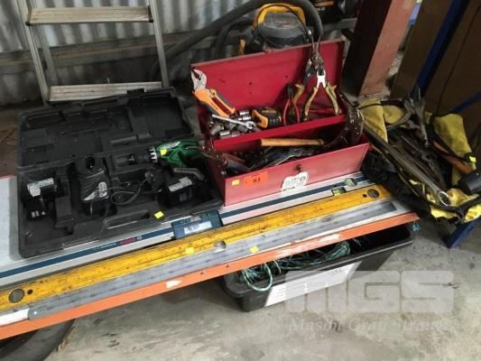 TOOLBOX & ASSORTED HAND TOOLS, VICE GRIPS, CUTTERS, SOCKETS, REPCO 1/4" RATCHET, SPANNERS, 18" SHIFTER, LEVELS, HITACHI CORDLESS DRILL WITH 2 x BATTERIES & CHARGER, ETC