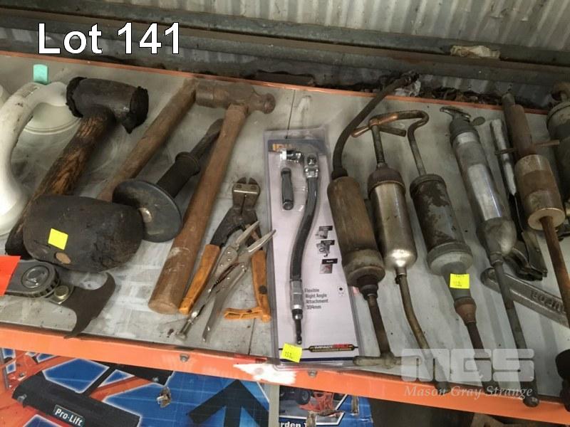 GREASE GUNS, AIR PUMPS, HAMMERS, GLASS SUCTION HANDLES, PAINT SPRAY GUNS & KERO GUNS, 1 x SHELF