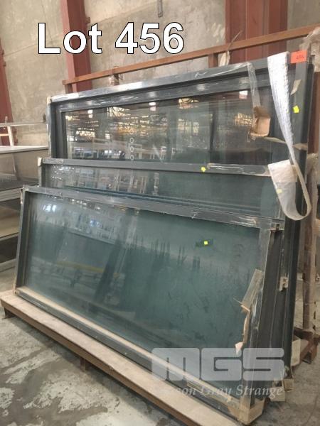DOUBLE GLAZED WINDOW ASSEMBLIES INC 2 x HINGED DOUBLE WINDOW UNITS, OVERALL SIZE 1690 (L) x 2085 (H) x 100mm (W), 1 x FIXED DOUBLE WINDOW, 2355 (H) x 1190 (L) x 100mm (W) & 1 x FIXED WINDOW 2355 x 975 x 150mm BROWN ALLOY TRIM 1 x STILLAGE