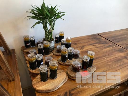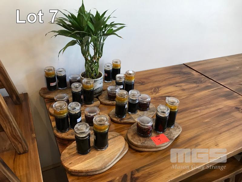 8 x TIMBER CONDIMENT TRAYS, CONDIMENTS & BAMBOO PLANT