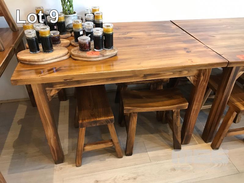 STAINED PINE TIMBER ORIENTAL STYLE DINING SUITE, RECTANGULAR TABLE & 4 x STOOLS 1200 x 1000mm