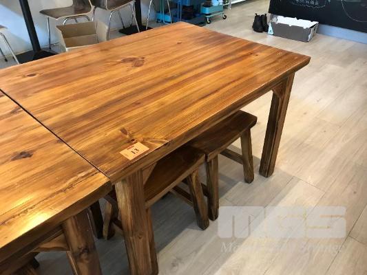 STAINED PINE TIMBER ORIENTAL STYLE TABLE, 1200 x 1000mm, DINING SUITE & 4 x STOOLS