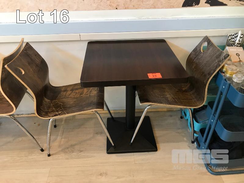 TIMBER LAMINATE SQUARE DINING TABLE, 60 x 600mm & 2 x DECORATIVE PLYWOOD CHAIRS