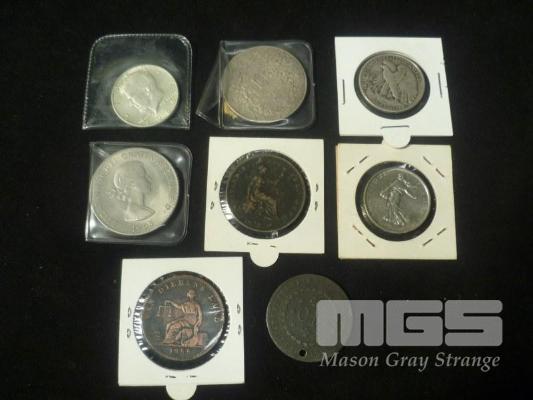 ASSORTED FORIGN COINS INC 2 X US HALF DOLLARS 1944 & 1964, POLISH 10 ZLOTY SILVER COIN 1933 1855 NEW TOWN TOLL GATEVAN DIEMENS LAND, 1857 BRITISH PENNY 1894 COPPER COIN WITH PENDANT HOLE, CHURCHILL CROWN, 1963 5 FRANC COIN