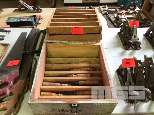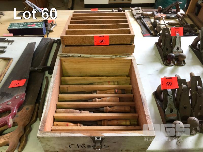 9 x VINTAGE CARPENTERS CHISELS, IN TIMBER BOX