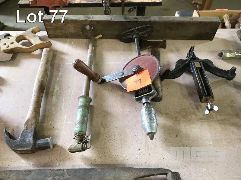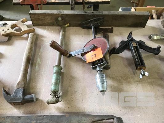 VINTAGE DRILL, AXE, RA VICE & SPRAY NOZZLE