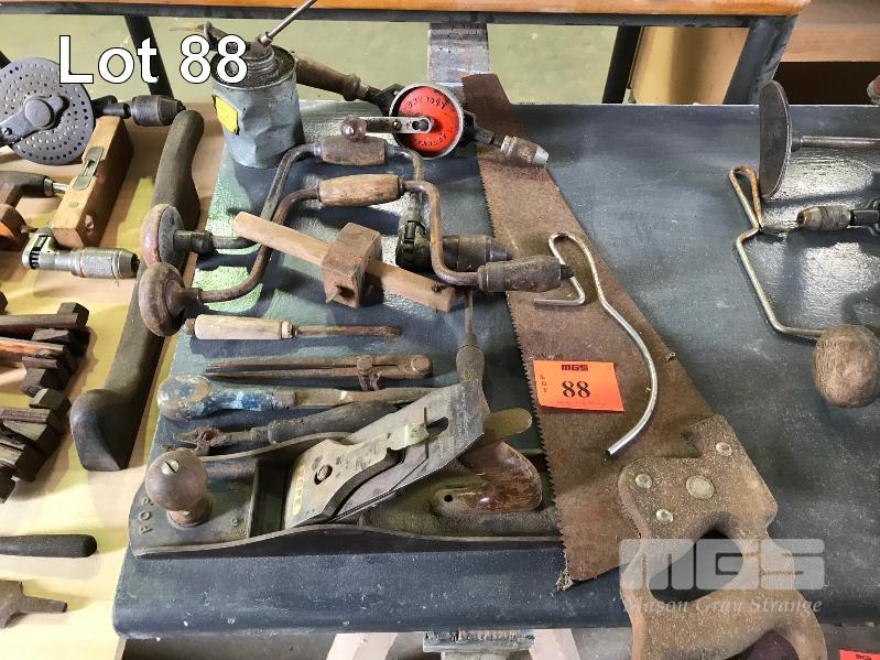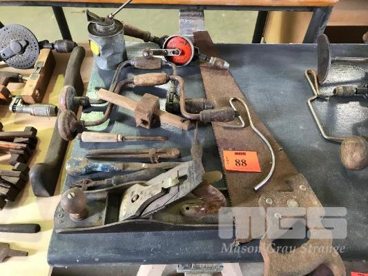 ASSORTED VINTAGE WOODWORKING TOOLS, SAW, DRILLS, POPE PLANE (NO. 5)