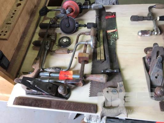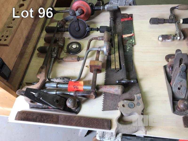 ASSORTED VINTAGE TOOLS, BRACE DRILLS, HAND DRILLS, PLANE, SAW ETC