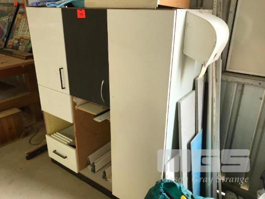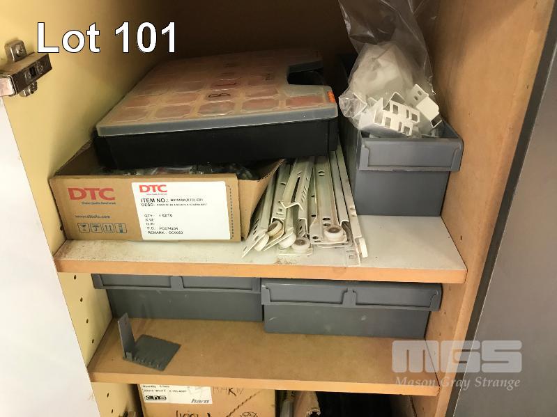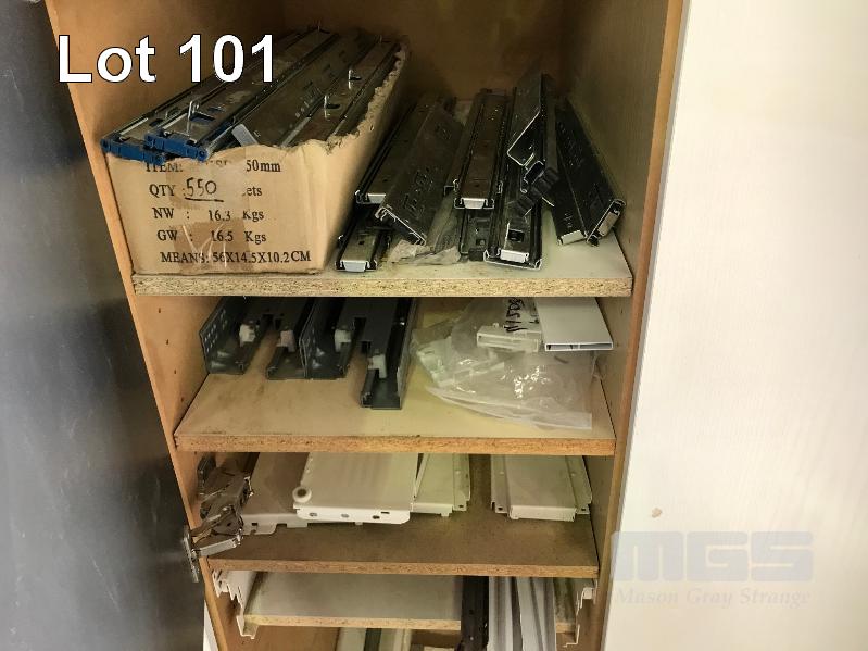 LAMINATE TIMBER CABINET & CONTENTS ASSORTED DRAWER RUNNERS