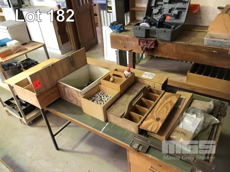 5 x TIMBER BOXES & CONTENTS ASSORTED NUTS, BOLTS, NAILS, SLIDES ETC