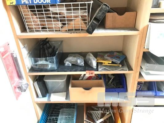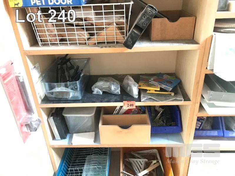 ASSORTED FURNITURE HARDWARE, BRACKETS, HINGES, FASTENERS, HEAVY DUTY DRAWER RUNNERS (CONTENTS SHELF UNIT)