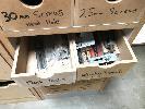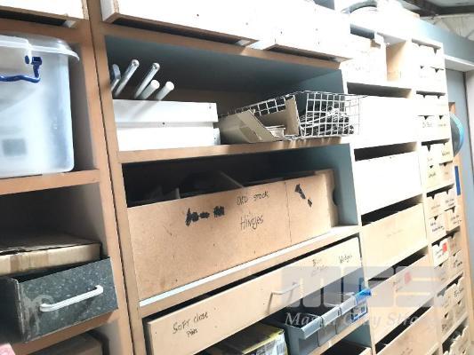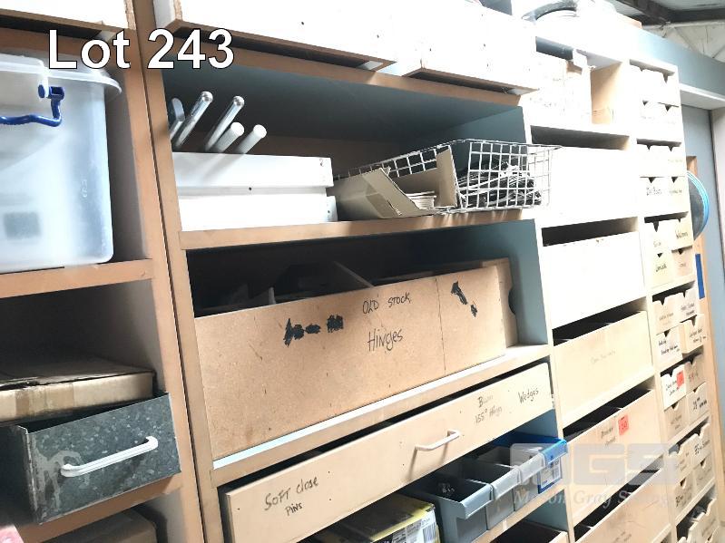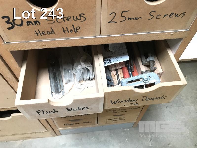 ASSORTED FURNITURE HANDLES, WHEELS, GRINDING DISCS ETC (CONTENTS DRAWERS)
