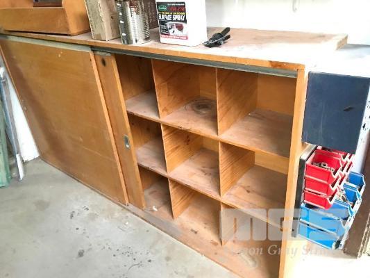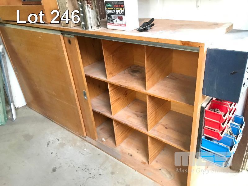 TIMBER SLIDING 2 DOOR CABINET, WITH PIGEON HOLE SHELVING INTERIOR