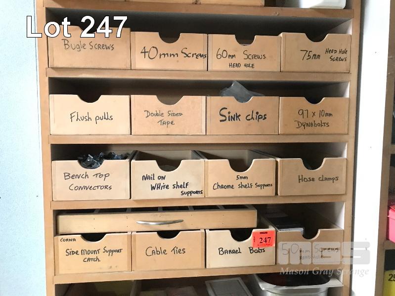 ASSORTED FASTENERS, BEAM SADDLES, BOLTS ETC (CONTENTS SHELF UNIT & DRAWERS)
