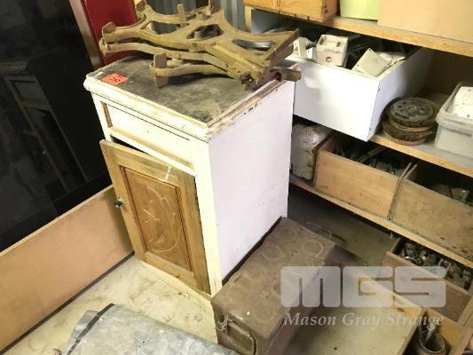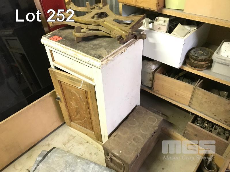 ANTIQUE SINGLE DOOR/DRAWER CABINET, 3 x CAST BENCH LEGS & AMMUNITION BOXES
