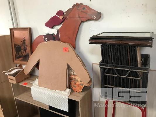 20 x HORSE RACING PHOTOGRAPHS & TIMBER HORSE ORNAMENTS