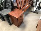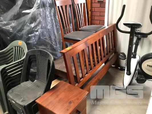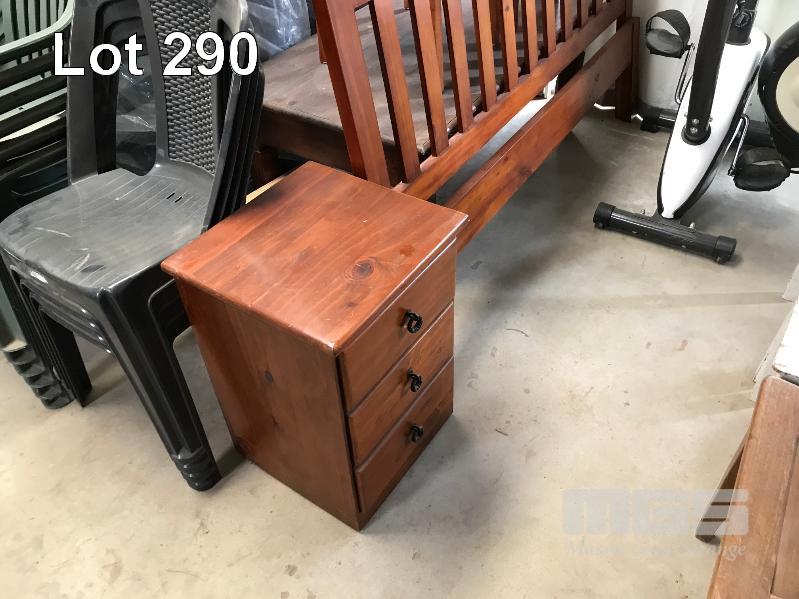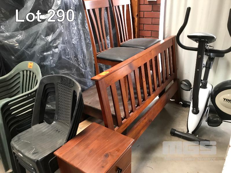 STAINED PINE QUEEN SIZE BEDHEAD & FOOT, 3 DRAWER BEDSIDE CHEST, RECTANGULAR OCCASIONAL TABLE & 2 x CHAIRS