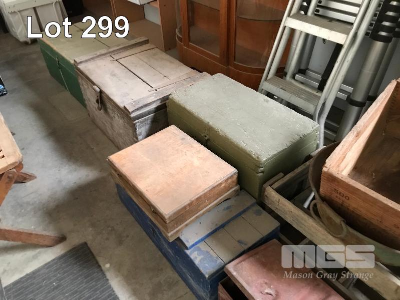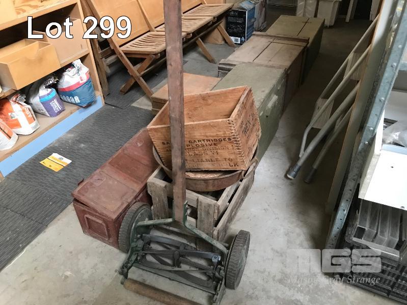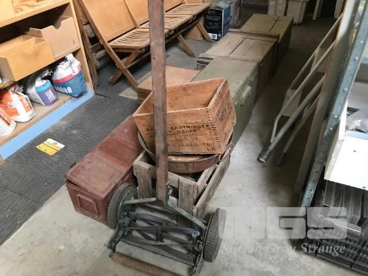 VINTAGE MANUAL LAWNMOWER & 6 x TIMBER CHESTS