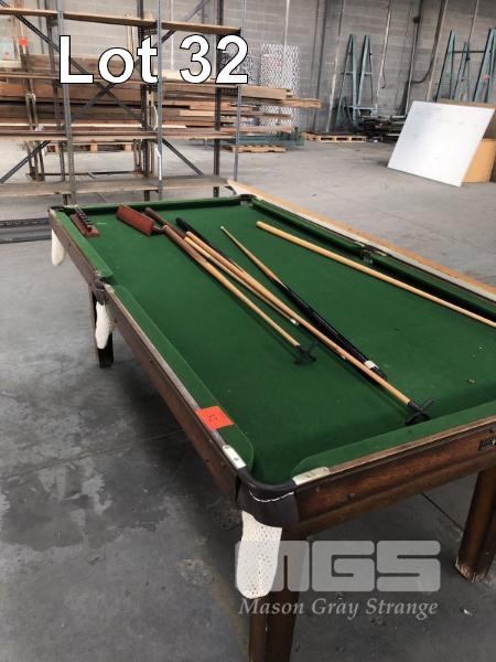 POOL TABLE, SLATE TOP BUMBLE BEE . 7 x 3'6" APPROX CUES AND STEADYS. WITH COVER SHEET