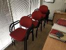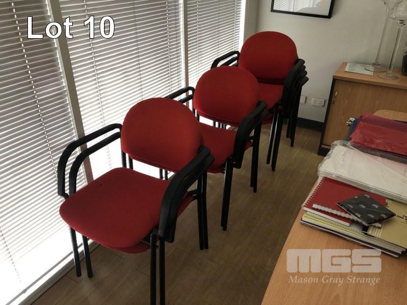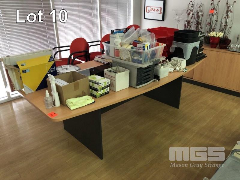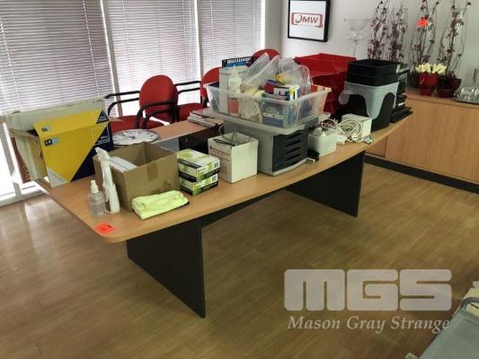 TIMBER LAMINATE MEETING ROOM TABLE, BEECH STORM, 2400 x 1200mm WITH 10 x RED CLOTH CHAIRS, MATCHING 2 DOOR CREDENZA WITH KEY, 1800 x 450mm