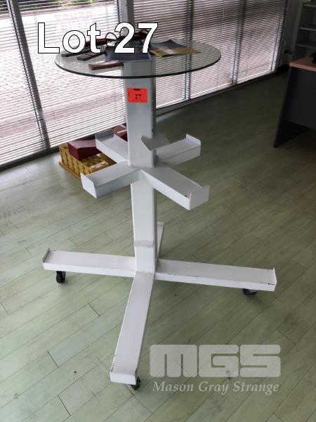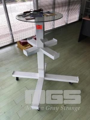 MOBILE DISPLAY STAND, STEEL FRAME, GLASS TOP, 1160mm (H)