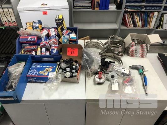 ASSORTED HOSE CLAMPS, FUEL CAPS, BATTERY TERMINALS, ASSORTED AUTOMOTIVE LIGHT GLOBES, ETC