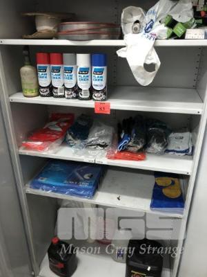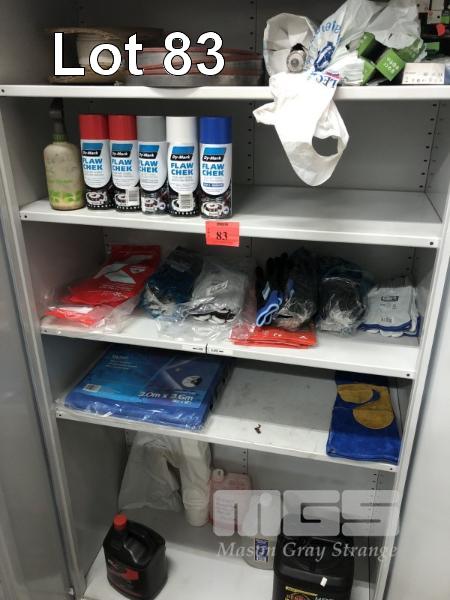 CHEMICALS, RIGGERS, FLAW CHECK TARP, LIGHT GLOBES, WORK GLOVES, SAW BLADES, CONTENTS CUPBOARD