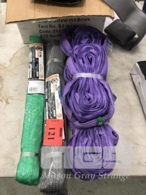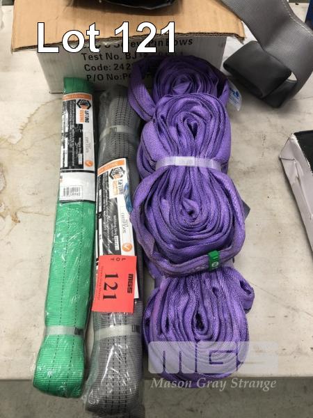 7 x ASSORTED NEW WEBB SLINGS, PURPLE, GREEN, GREY & BOX SLEEVES