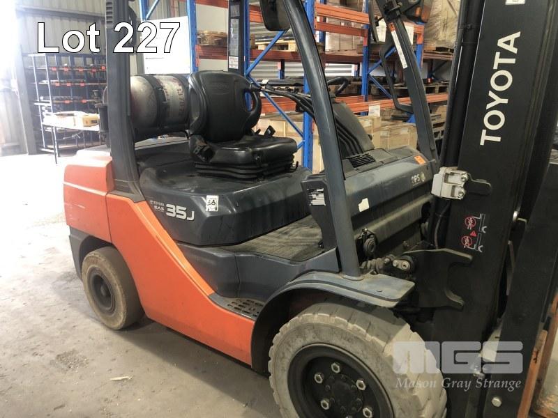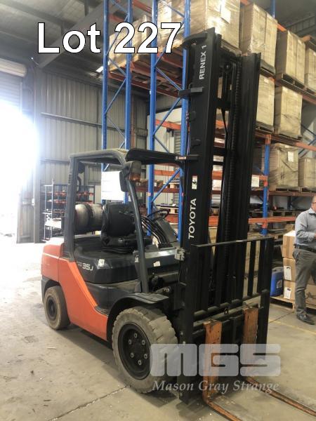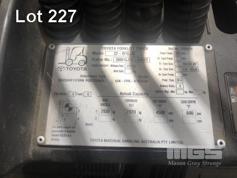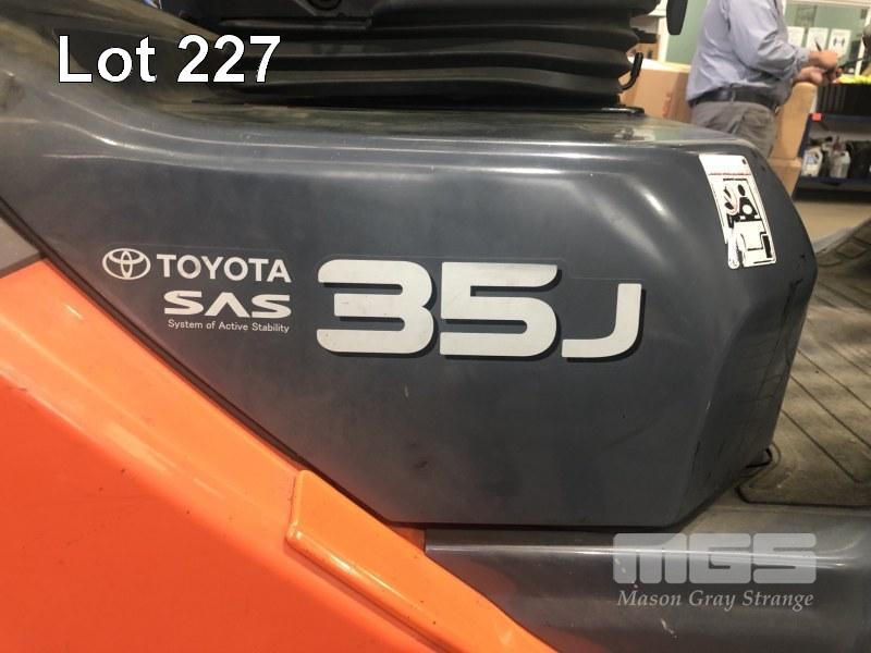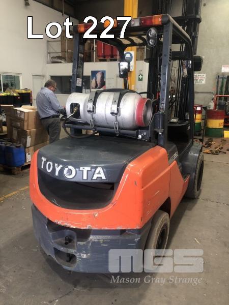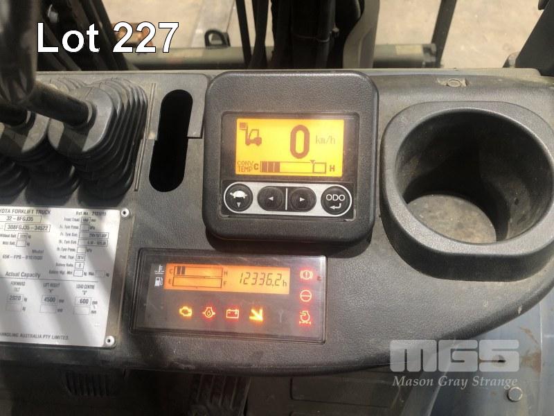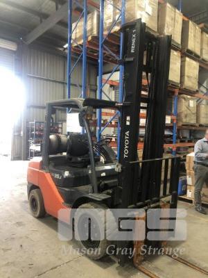 TOYOTA FORKLIFT MOD: 32-8FGJ35 FRAME: 308FGJ35-34522 HOURS: 12,350 SHOWING 2 STAGE SEE THRU MAST, 4,500mm 2,930kg LIFT CAPACITY SIDE SHIFT, BLADE SHIFT, PUNCTURE PROOF TYRES, LPG