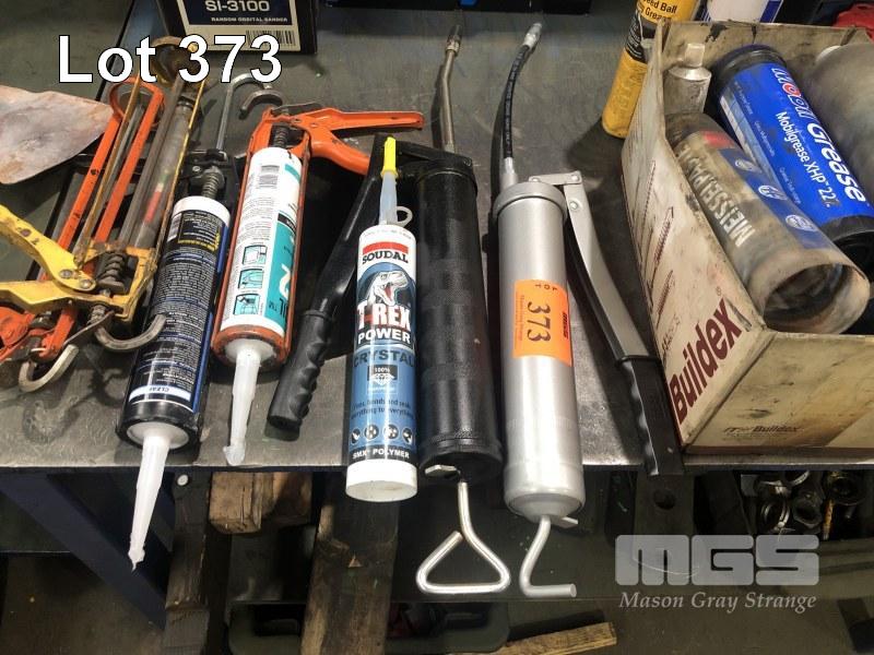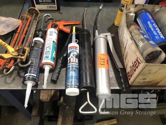 2 x GREASE GUNS, 2 x CAULKING GUNS & ASSORTED GREASE TUBES & SILICONES