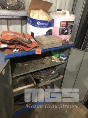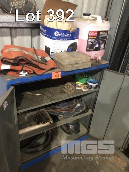 WELDING CABINET, 110cm & STOCK INCL SPATTER SHEILD, APRONS, HOSES, AUTO SHIELD MASK, MIG TIPS, CLAMPS, ETC