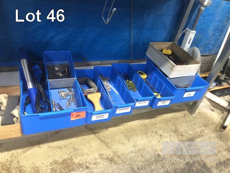 6 x BLUE PLASTIC TRAYS & CONTENTS DRIVE BITS, WORK LIGHT, SCISSORS, TAPES, ETC