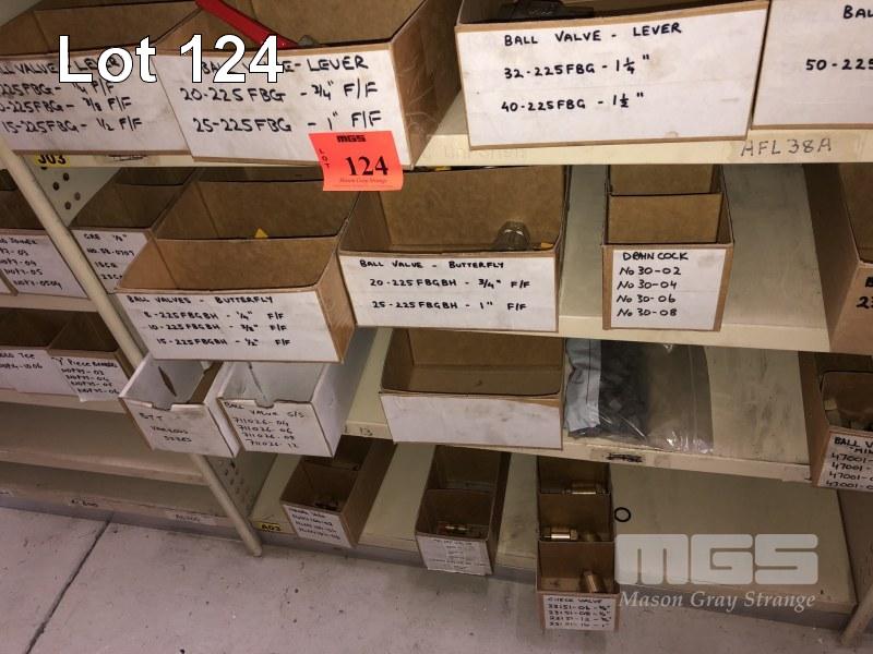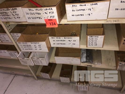 CONTENTS OF 4 SHELVES, VARIOUS BALL VALVES, 1/4' - 2', DRAIN TAPS, BRASS & STAINLESS, CHECK VALVES, RELEASE VALVES, NEEDLE VALVES
