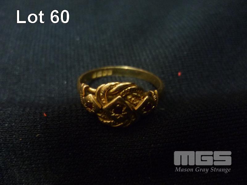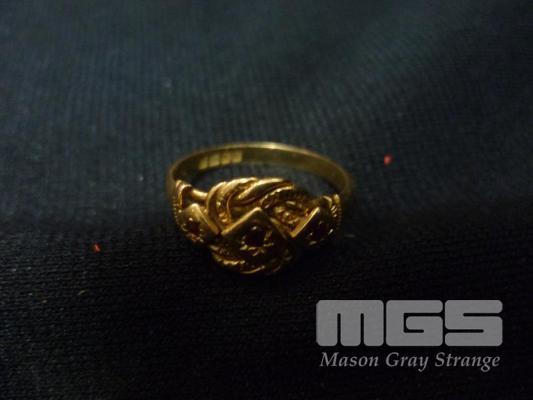 GOLD RING, SET WITH 3 X SMALL RED STONES, MARKED 18CT, 3.74 grams
