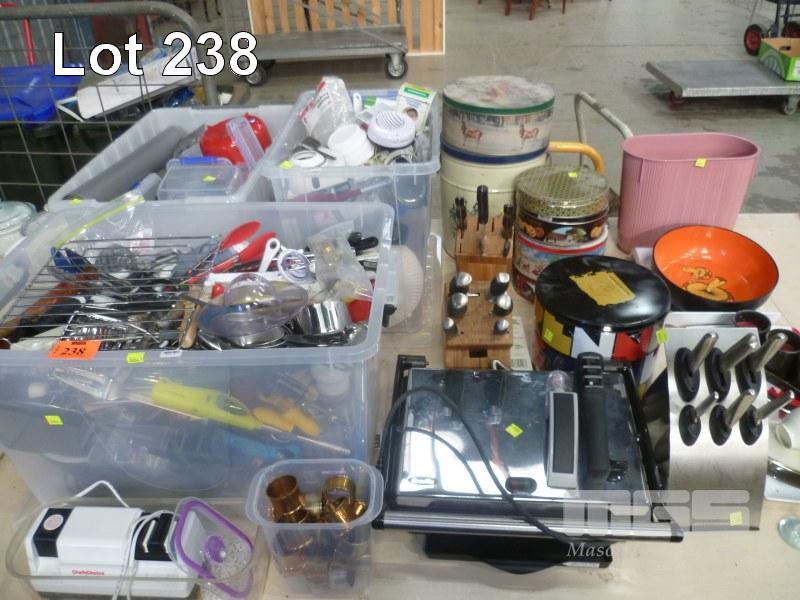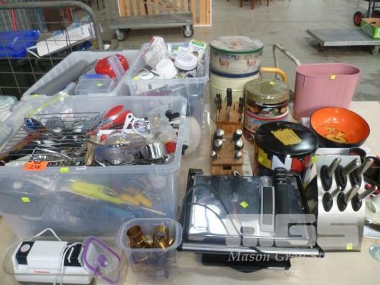 ASSORTED KITCHENWARE, UTENSILS, CUTLERY, BREVILLE SANDWICH PRESS, ETC, 1 x TABLE
