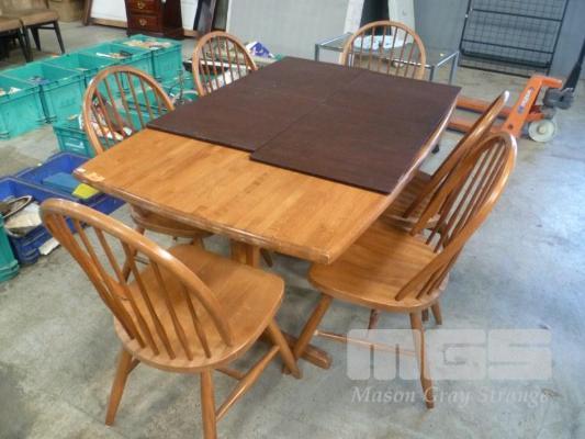 TIMBER 7 PIECE DINING SUITE INC RECTANGULAR DINING TABLE, STRETCHER BASE WITH 6 x SPINDLE BACK, ARCHED, DINING CHAIRS