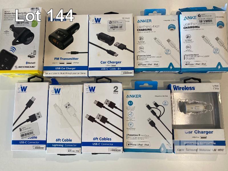 10 x ASST ACCESSORIES INC. WIRELESS HANDS-FREE CAR KIT, FM TRANSMITTER, CAR CHARGERS, LIGHTNING CABLES, USB-C CABLES (OPEN BOX)